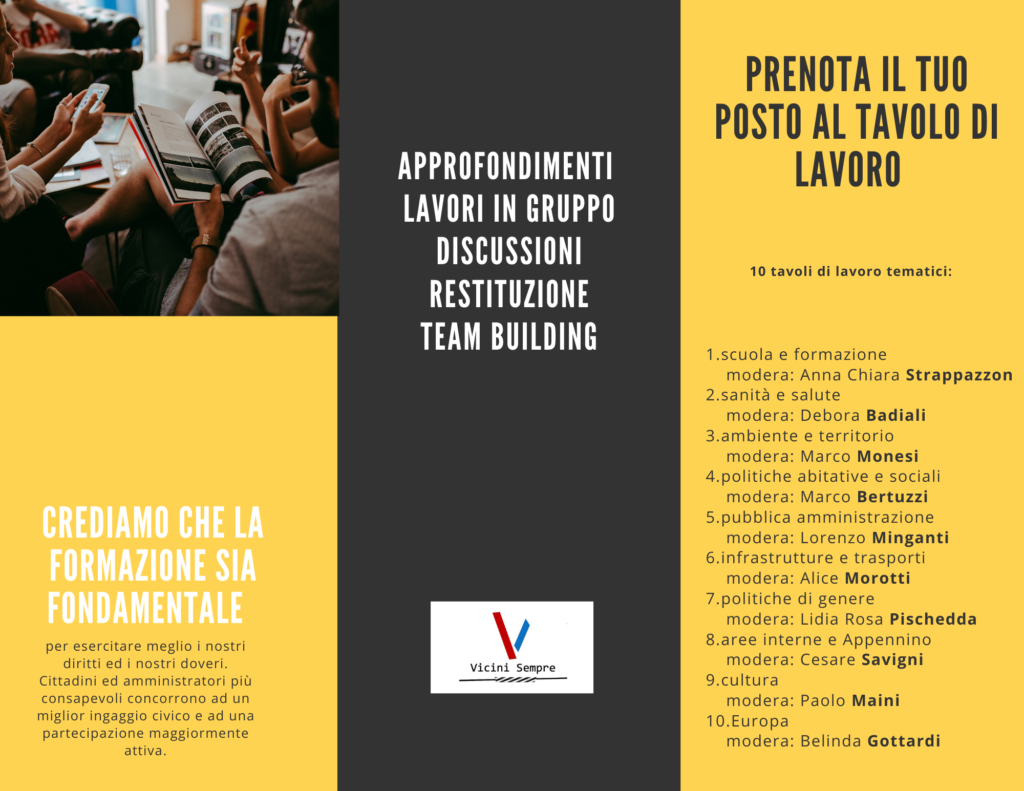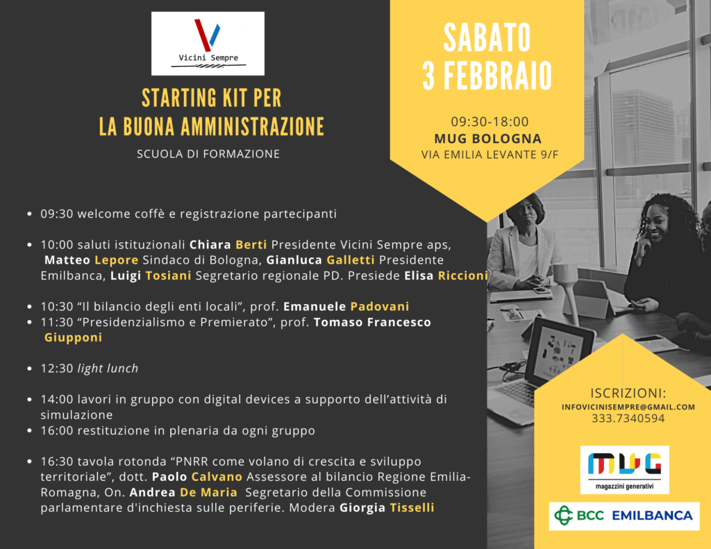 - 10:00 saluti istituzionali Chiara Berti Presidente Vicini Sempre aps, Matteo Lepore Sindaco di Bologna, Gianluca Galletti Presidente Emilbanca, Luigi Tosiani Segretario regionale PD. Presiede Elisa Riccioni